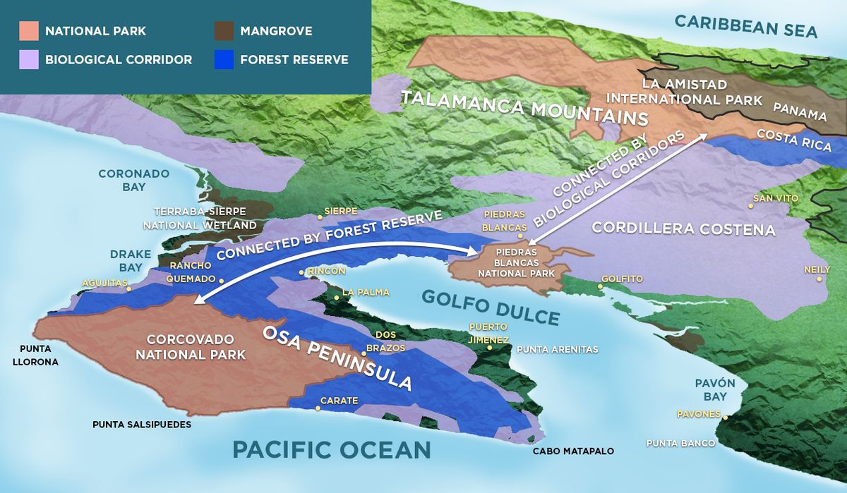 The connected vision for the wider Corcovado to La Amistad landscape, with functional connectivity between protected areas established by active restoration and land protection of corridors. Source: Osa Conservation